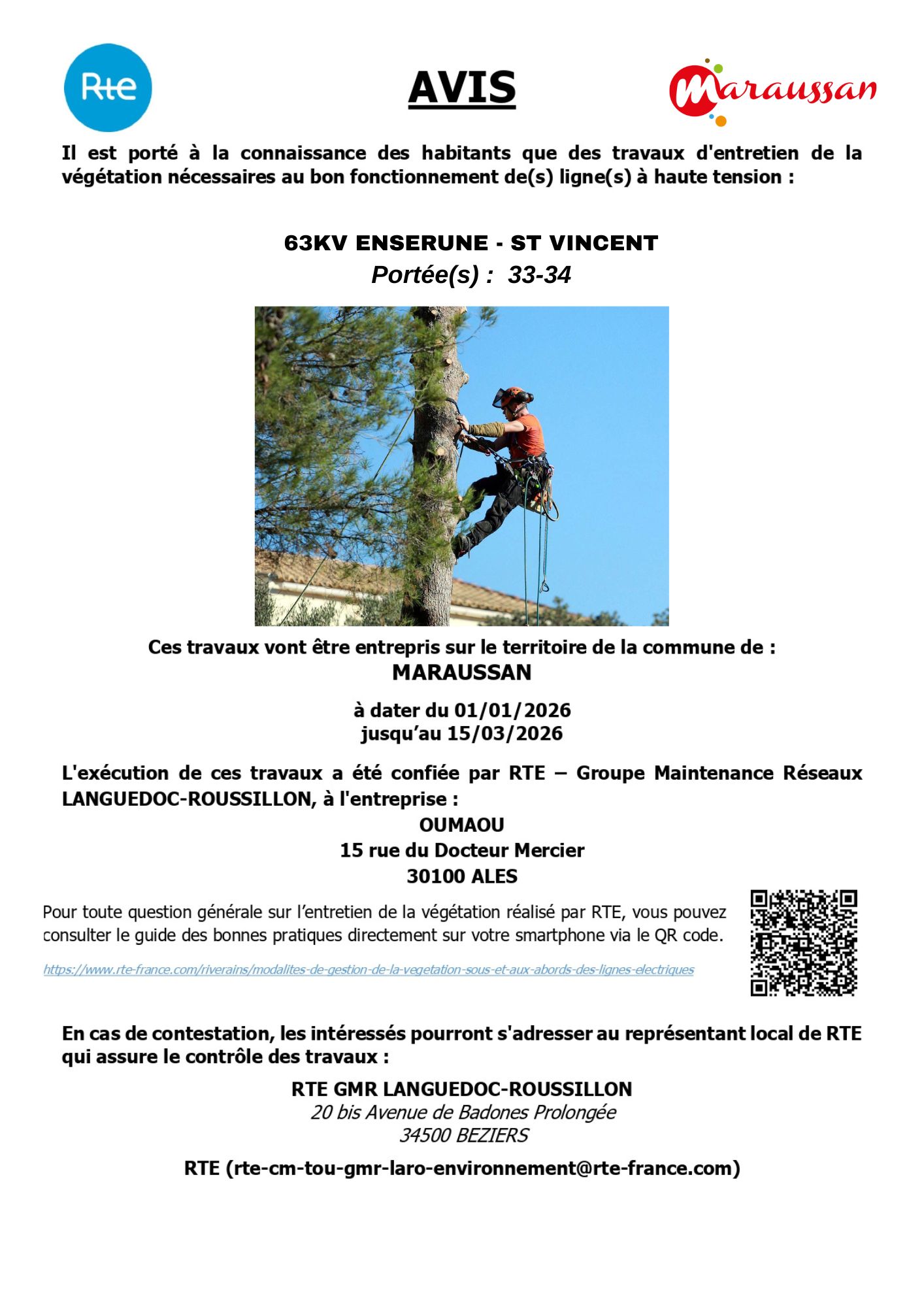 Des travaux d’entretien de la végétation nécessaires au bon fonctionnement des lignes haute tension auront lieu du 1er janvier au 15 mars 2026 sur la commune.