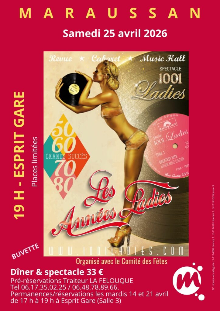 Dîner & spectacle 33 € Pré-réservations Traiteur LA FELOUQUE : Tel 06.17.35.02.25 / 06.48.78.89.66. Permanences/réservations les mardis 14 et 21 avril de 17 h à 19 h à Esprit Gare (Salle 3)