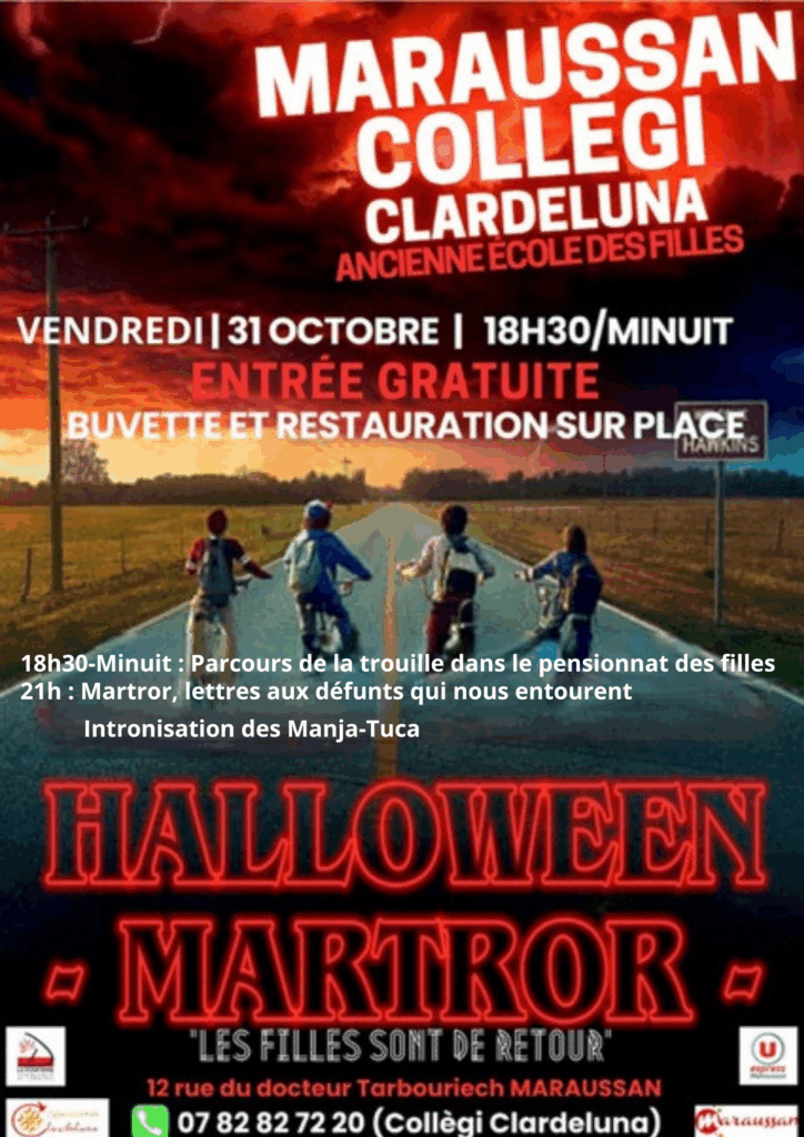 HALLOWEEN « MARTROR, LES FILLES SONT DE RETOUR » Buvette et restauration sur place de 18h30 à minuit: parcours de la trouille dans le pensionnat des filles 20h00 : intronisation des Manja-Tuca 21h00 : Martror, lettres aux défunts qui nous entourent