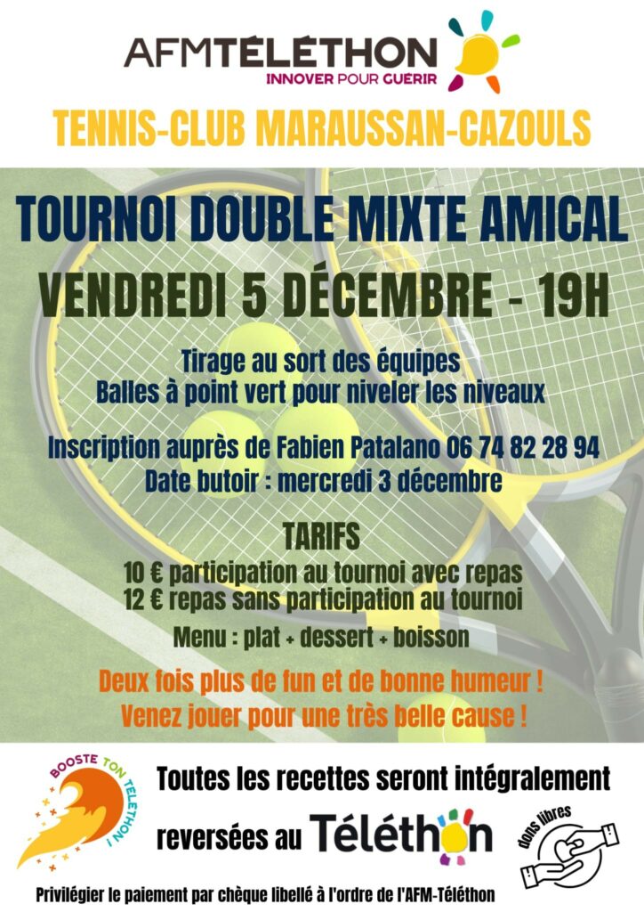 TOURNOI DOUBLE MIXTE AMICAL Tirage au sort des équipes Balles à point vert pour niveler les niveaux Menu : plat + dessert + boisson Toutes les recettes seront reversées au Téléthon. Paiement conseillé : par chèque à l’ordre de l’AFM-Téléthon