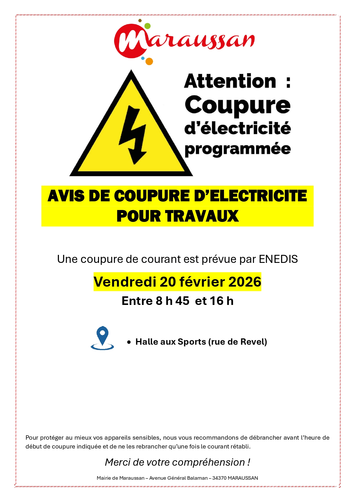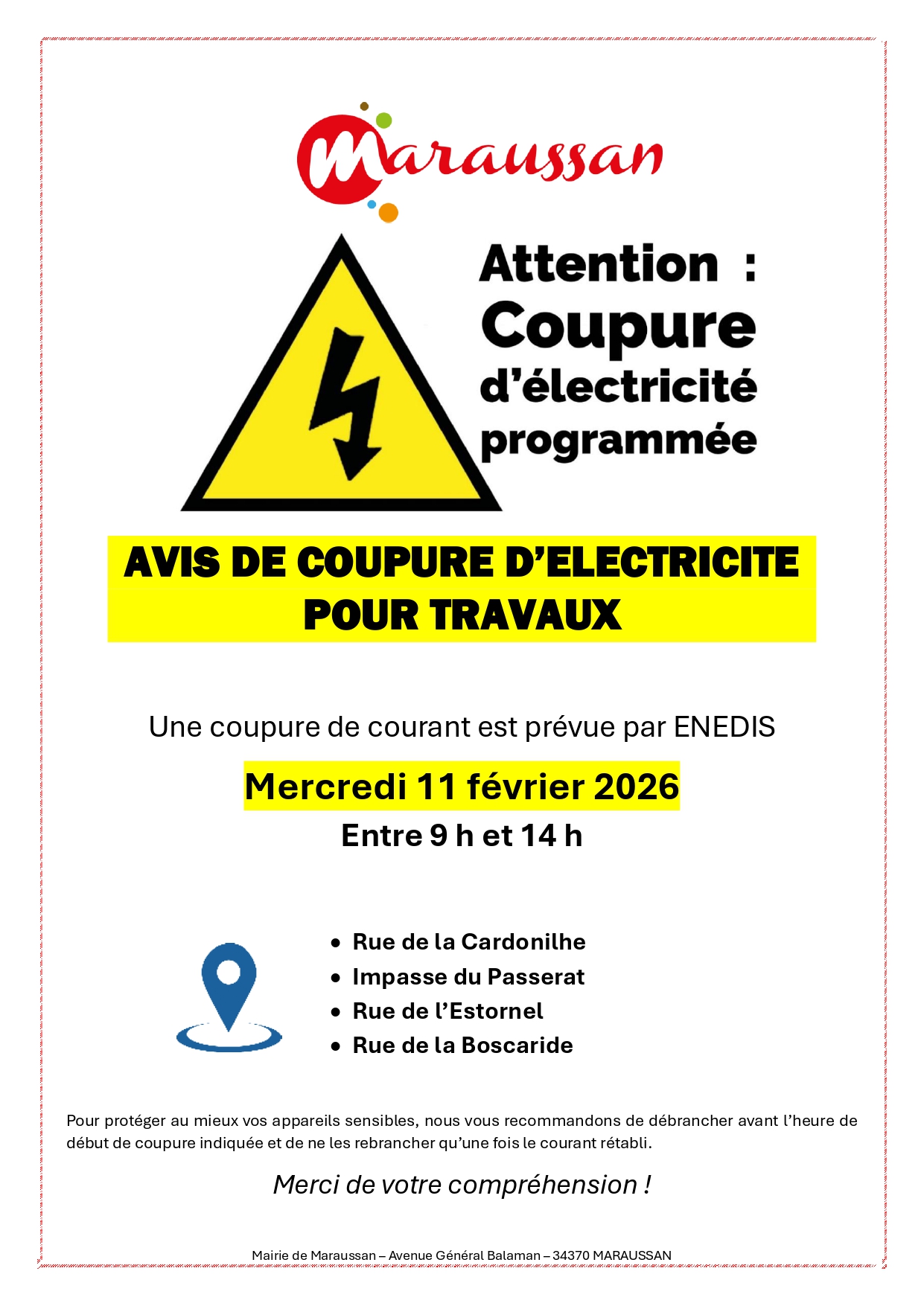 Coupures d’électricité programmées pour travaux (dans certains quartiers de Maraussan) les 11 et 20 février 2026.